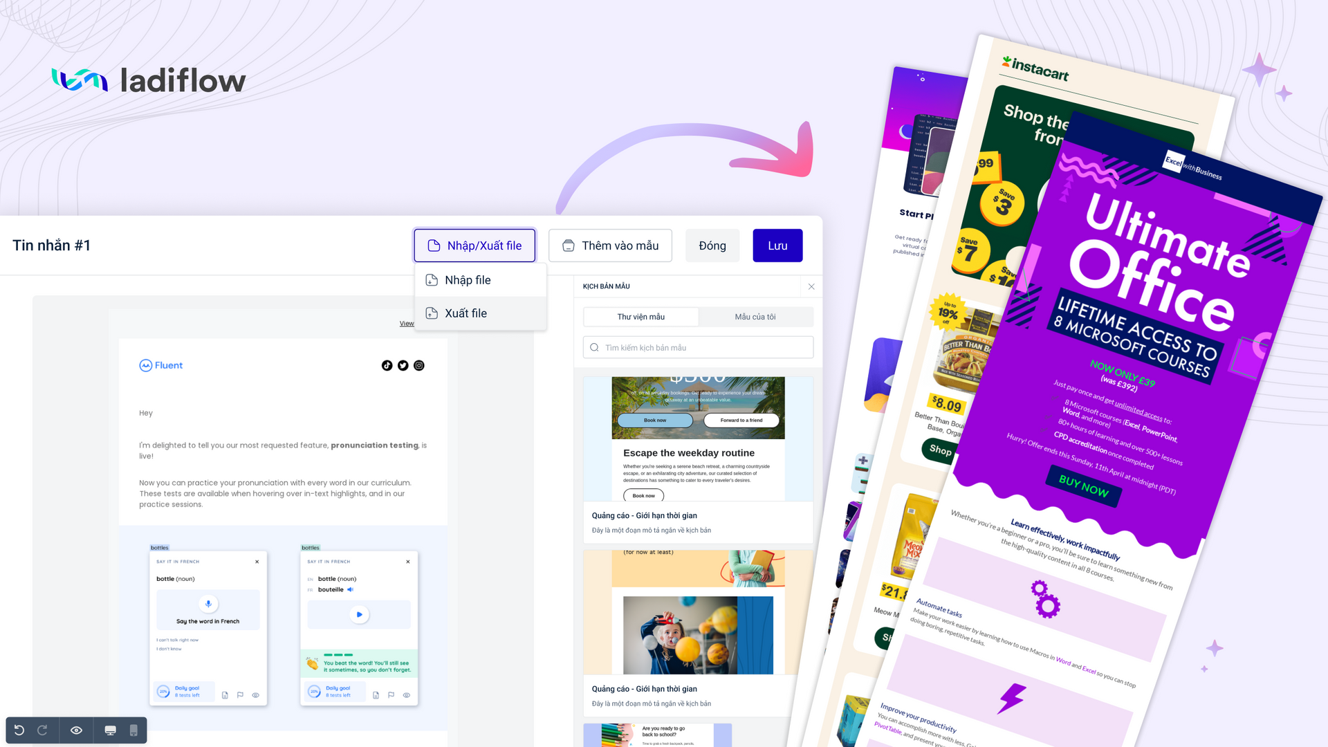 Bạn có thể nhập thiết kế email đã có lên hệ thống. LadiFlow sẽ tự động xác định trình thiết kế email phù hợp với định dạng file nhập. LadiFlow hỗ trợ 2 định dạng file nhập: html và .emailldf. Việc thiết kế email trở nên dễ dàng hơn rất nhiều. Xem chi tiết.