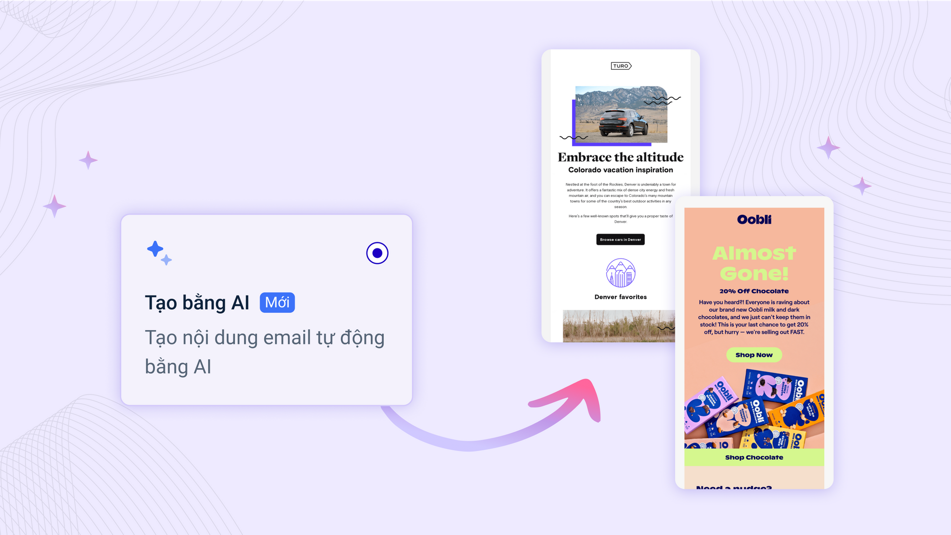 Bạn có thể sử dụng AI với công nghệ ChatGPT mới nhất của OpenAI để tạo nội dung email mà không mất thời gian suy nghĩ nội dung, ý tưởng. Ngoài ra, sử dụng AI tạo email sẽ giúp bạn giảm các lỗi khiến email rơi vào spam. Các tài khoản đăng đi gói từ Standard trở lên mới có thể sử dụng tính năng này. Hệ thống sẽ tính phí dựa trên lượng thông tin nhập vào và AI tạo ra, xem thêm TẠI ĐÂY.