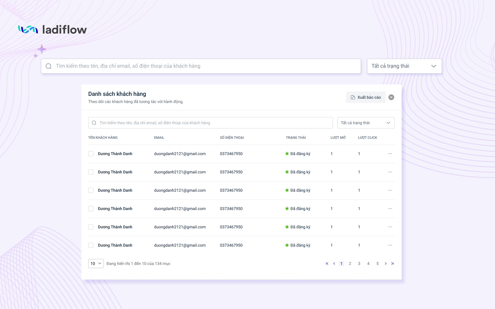 2. Công cụ tìm kiếm và bộ lọc trong Danh sách khách hàng chi tiết tại Báo cáo Flow