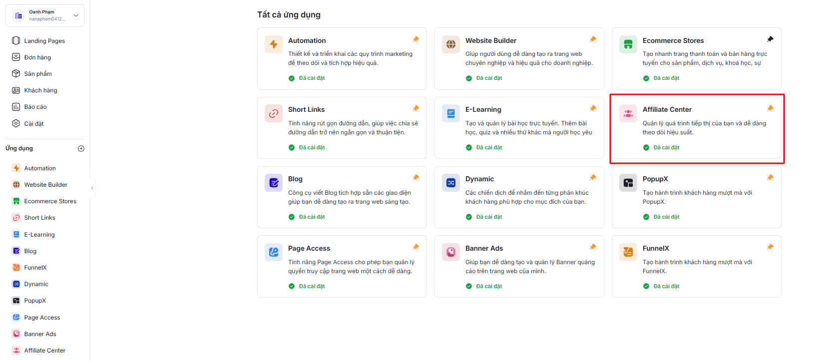 1. Bổ sung ứng dụng Affilate Center vào kho ứng dụng LadiPage