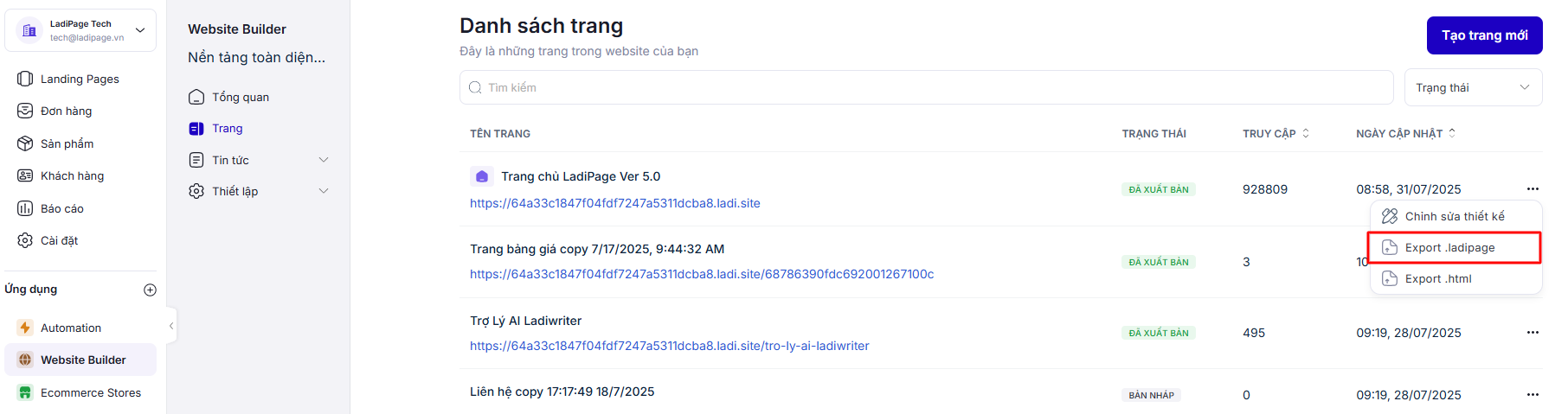 2. Website : Cho phép tải file.ladipage của từng trang con