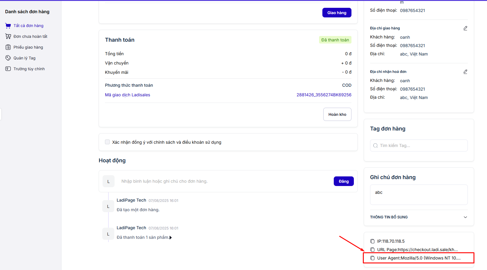 5. Đơn hàng :bổ sung thông tin user_agent, fbc, fbp, event_id