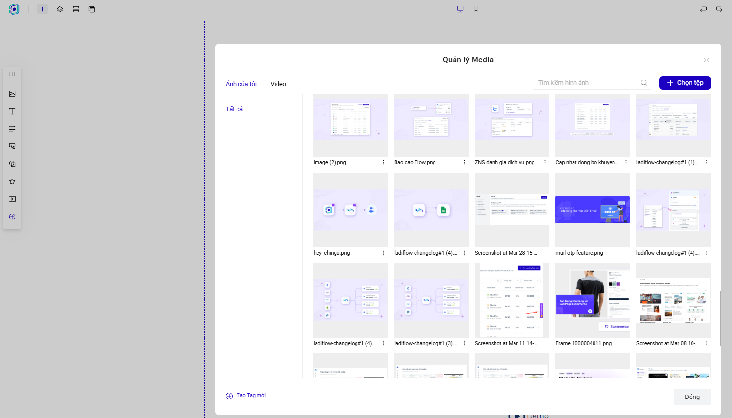 Lưu ý :“Khi tính năng này được cập nhật, tất cả tập tin đã tải lên trước đó sẽ chỉ còn hiển thị trong mục quản lý tập tin của Builder LadiPage. Các ứng dụng Blog và Website sẽ bắt đầu với kho tập tin trống, và bạn cần chủ động bổ sung, cập nhật lại để sử dụng.”