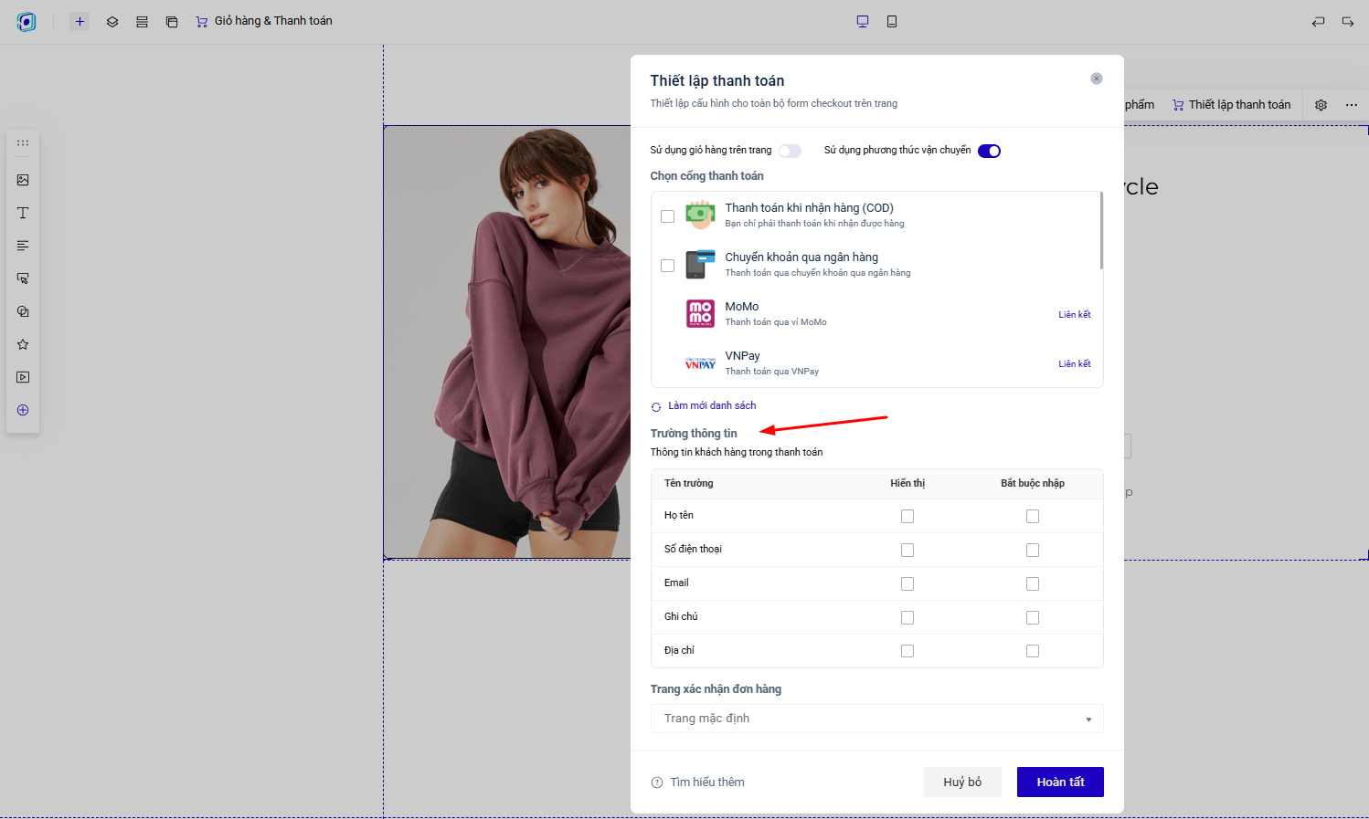 👉 Thao tác: Truy cập Builder LadiPage → Sản phẩm mẫu → Thiết lập thanh toán.