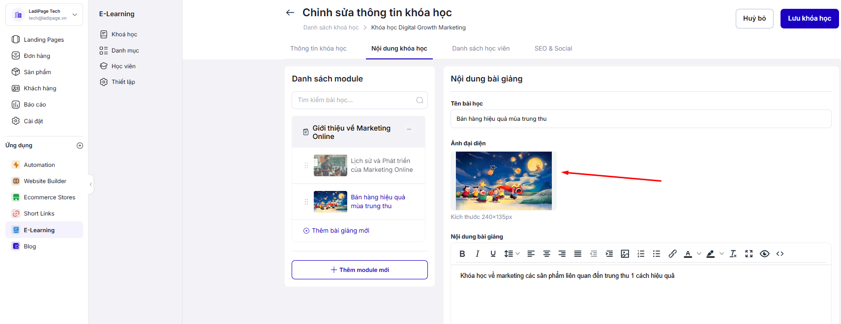 Nhằm tối ưu về hiển thị nội dung khi truy cập và chia sẻ, E-Learning cập nhật phần thiết lập ảnh thumb cho khóa học với nội dung dạng Text