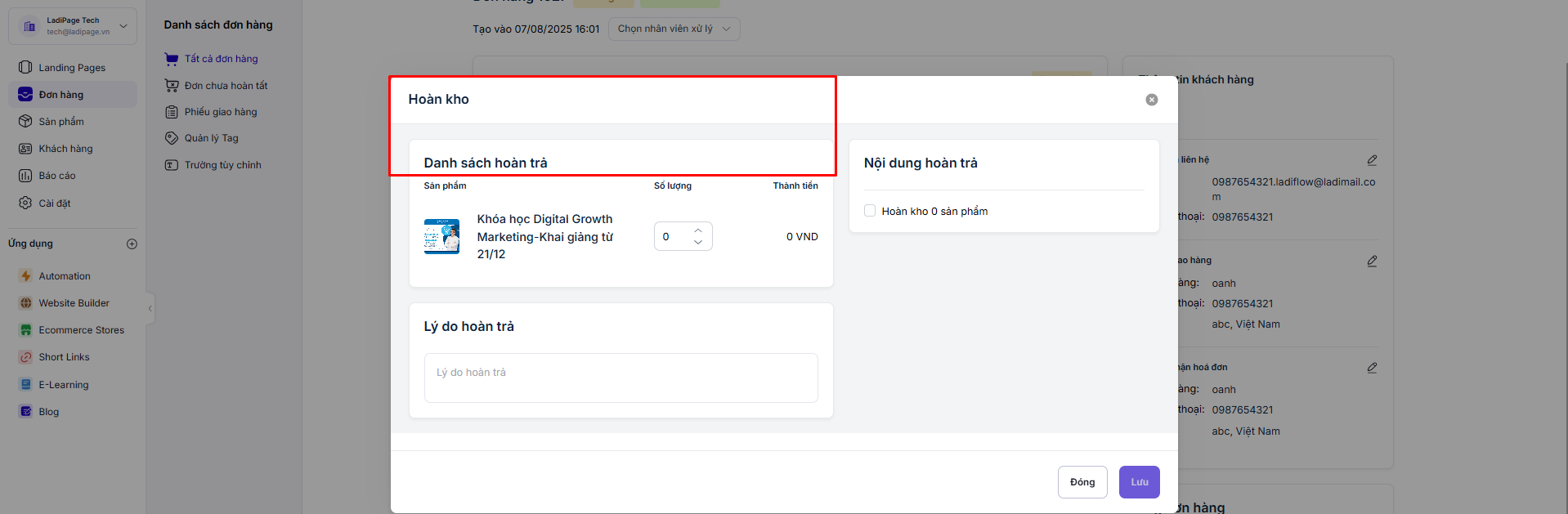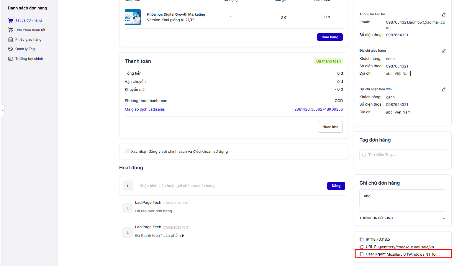 Tính năng này cho phép tự động lưu trữ các biến hệ thống như user_agent, fbc, fbp, event_id từ form checkout của Ladipage về mục thông tin tùy chỉnh của Đơn hàng. Việc này hỗ trợ ghi nhận đầy đủ thông tin truy vết người dùng, phục vụ mục đích tracking nâng cao, đồng bộ dữ liệu chuyển đổi (conversion matching) và phân tích hành vi trên các nền tảng quảng cáo như Meta Pixel.