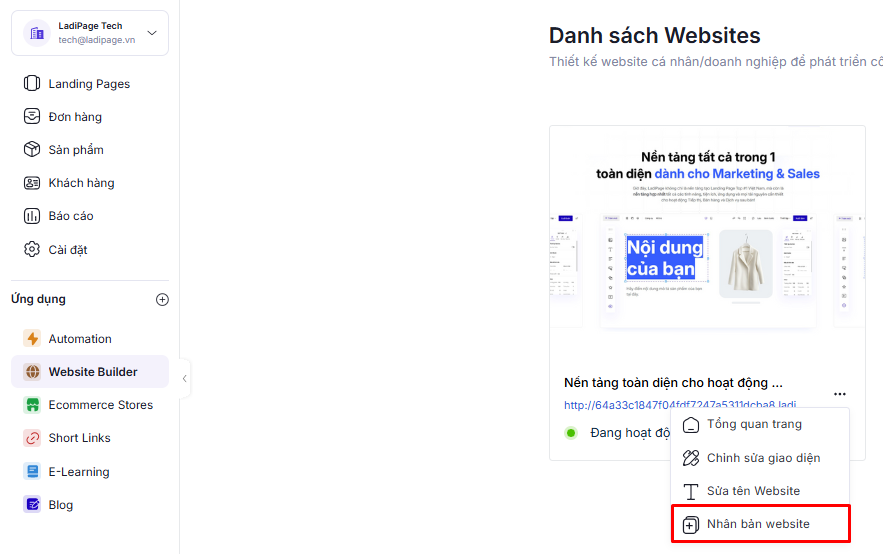 Nhằm tối ưu quá trình thao tác và rút ngắn đáng kể thời gian tạo nội dung cho trang web, Website Builder đã chính thức cập nhật tính năng “Nhân bản Website sang một trang mới”.