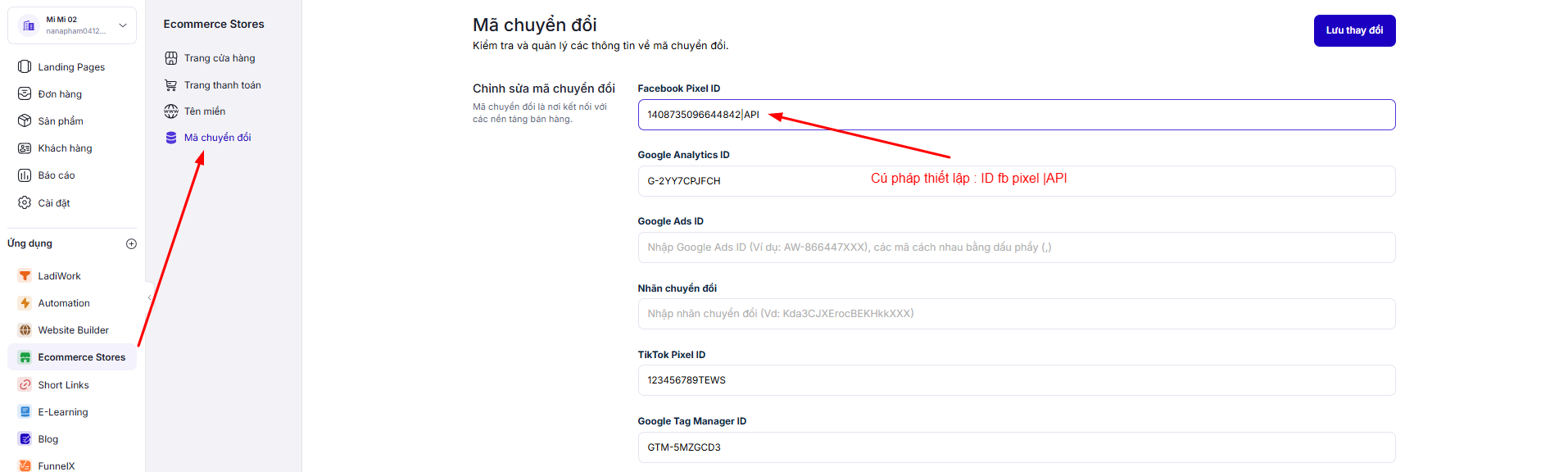 Bước 2 : Truy cập ứng dụng Ecomerce Store, mã chuyển đổi, gắn ID facebook pixel muốn thiết lập bắn sự kiện