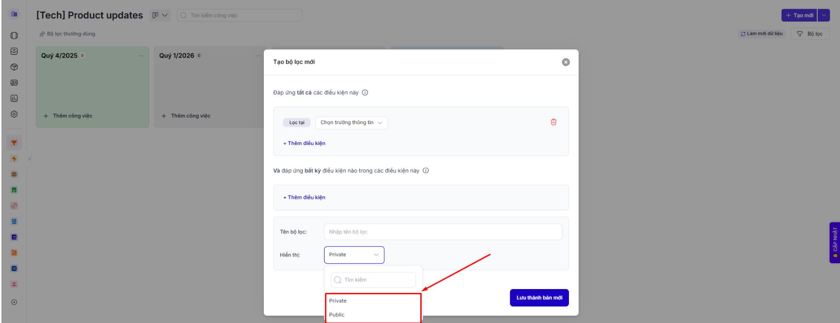 Public: Bộ lọc được chia sẻ và hiển thị cho tất cả thành viên trong workspace có quyền truy cập module.