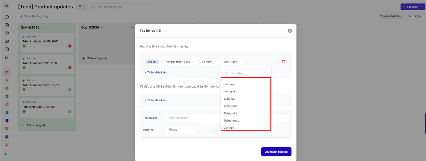 Đã thêm các lựa chọn mốc thời gian giúp người dùng chọn nhanh khi tạo bộ lọc, không cần nhập thủ công.
