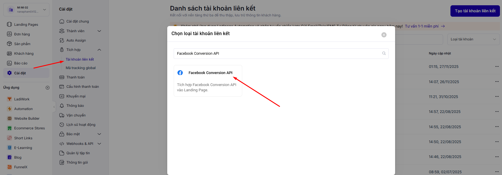 Bước 1 : Truy cập mục Cài đặt -> Tích hợp -> Tài khoản liên kết, tích hợp Facebook Conversion API