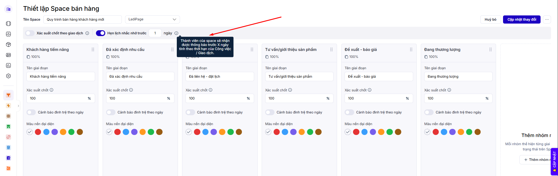 Dựa theo thiết lập của từng Space, các thành viên liên quan sẽ nhận được các thông báo tương ứng với khoảng thời gian thiết lập , tối thiểu là 1 ngày trước khi hết hạn công việc/ giao dịch
