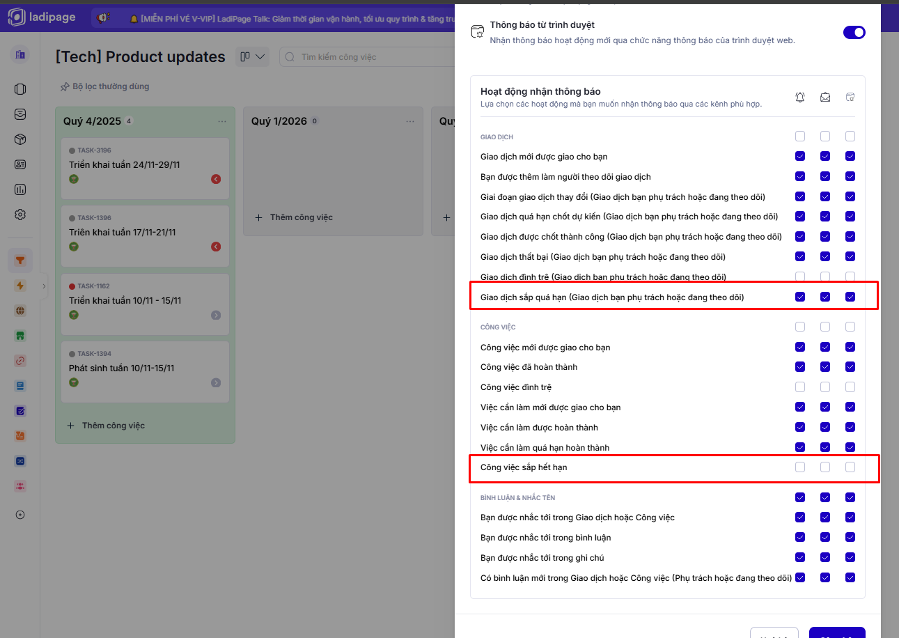 Hệ thống LadiWork đã bổ sung cơ chế gửi thông báo trước khi công việc hoặc giao dịch (deal/task) đến hạn, giúp người dùng tránh bỏ sót deadline và chủ động xử lý công việc.