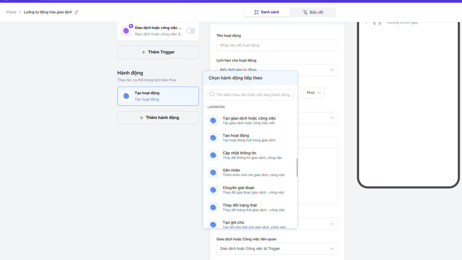 Dựa theo hành vi mong muốn, bạn có thể thiết lập các Trigger và Hành động tương ứng, từ việc tạo giao dịch tự động, tạo hoạt động tự động khi đáp ứng các điều kiện đã thiết lập như tự động tạo hoạt động liên hệ khách hàng, gửi email, gửi báo cáo...
